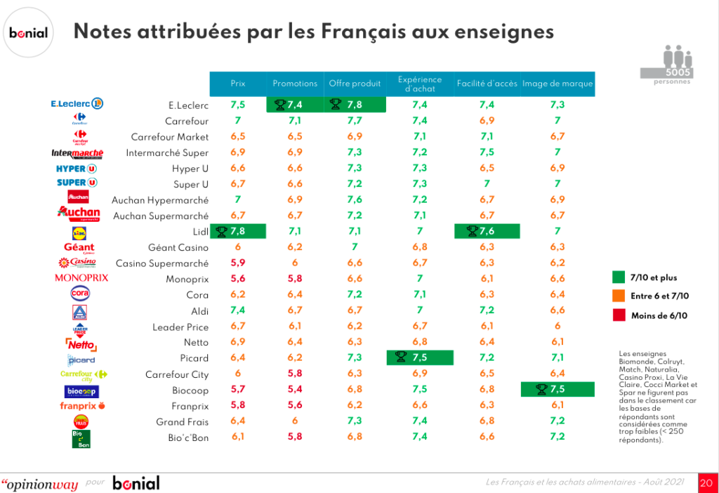 - Leclerc est en tête sur les promotions proposées (7,4/10) et l' »offre produit » (7,8/10)