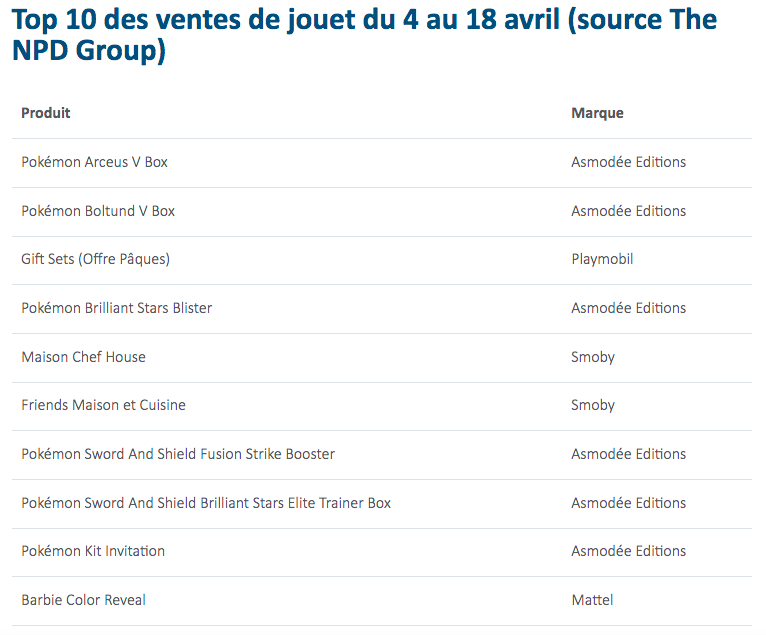 Parmi les 10 jouets les plus vendus, on note la forte présence des jouets sous licence et notamment de celle Pokemon qui concerne 6 jouets sur 10 dans le classement. Comme l’évoquait déjà NPD en ce début d’année, la vente des jouets sous licence devrait continuer sur la même dynamique que celle en 2021 qui avait marqué son « retour en force » (Source Point de vente). La sortie de plusieurs films pour la jeune génération dans les prochains mois devrait donc confirmer et conforter cet attrait.