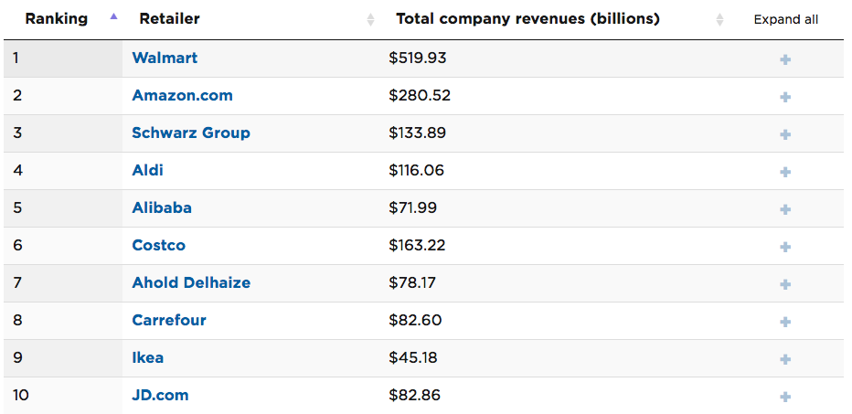 En collaboration avec Kantar, la NRF (National Retail Federation américaine) a publié la liste des 50 enseignes les plus importantes dans le monde du retail en 2021 (en se basant sur les données de 2020). Les critères :