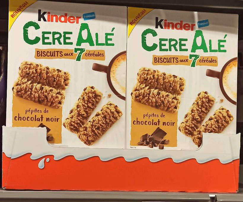 Ferrero France lance officiellement sa nouvelle gamme Kinder CereAlé dans l’hexagone en ce début d’année. Ce produit, composé comme son nom l’indique de céréales (blé, épeautre, riz, maïs, seigle, sarrasin et avoine), est destiné à être consommé au petit-déjeuner. Les gourmands auront le choix entre une recette à base d’éclats de noisettes et une autre à base de pépites de chocolat. Avec cette offre, la marque souhaite également attirer de nouveaux consommateurs dont les jeunes adultes. Le prix de vente conseillé sera de 2,79 € les six sachets de deux biscuits.