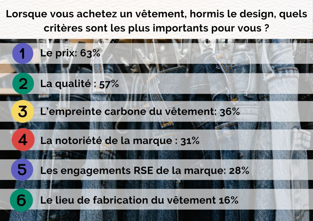 Les répondants accordent de plus en plus d’importance au positionnement éthique des marques. 42% des sondés disent avoir déjà boycotté une marque si cette dernière était accusée de ne pas respecter l’environnement ou les conditions de travail de ses employés. Cette dimension RSE, est de plus en plus importante pour les sondés. 36% d’entre eux classent en troisième position « l’empreinte carbone » du vêtement comme étant un critère important.