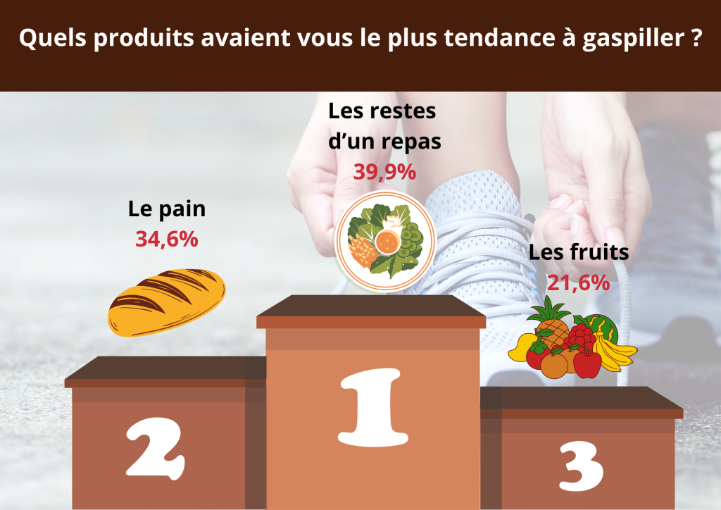 26,8% des répondants disent jeter 1 ou plusieurs fois / semaine de la nourriture (dont 7,4% tous les jours). Parmi les produits les plus jetés à la poubelle, on retrouve notamment les restes des repas, le pain et les fruits.