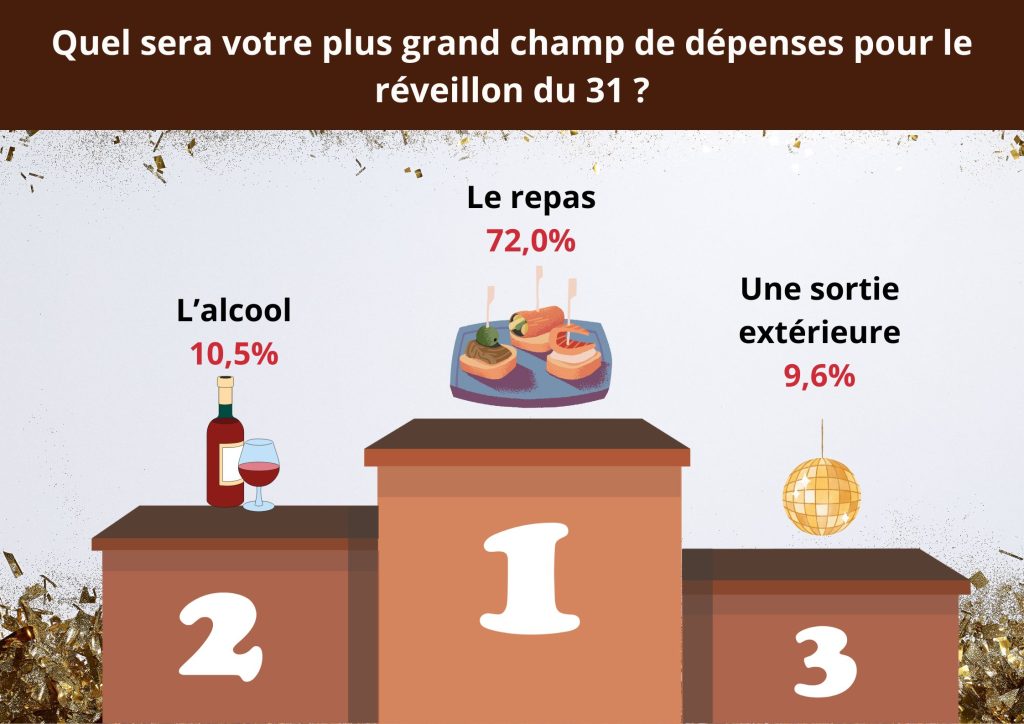Avec la hausse des prix, une réduction des dépenses est à prévoir par rapport à l’année précédente. 44,5% de ceux qui vont réveillonner et qui prévoient de réduire leurs dépenses vont moins dépenser pour le repas, 40,6% pour l’alcool, 33,2% pour la décoration et enfin 28,9% pour les vêtements/déguisements.