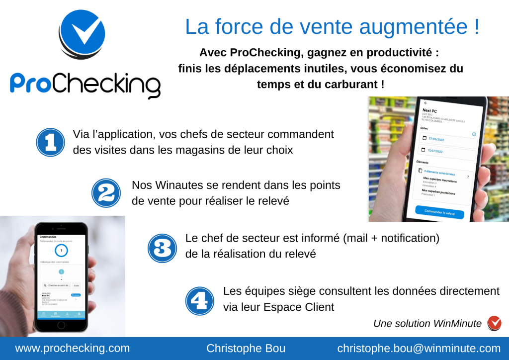 Avec ProChecking, les chefs de secteur délèguent à notre communauté de Winautes Conso les visites de store-check. Via notre application, ils commandent des visites dans les magasins de leur choix, choisissent les informations qu’ils souhaitent recueillir et la date des visites. Les Winautes se rendent alors dans les points de vente demandés pour réaliser le relevé.