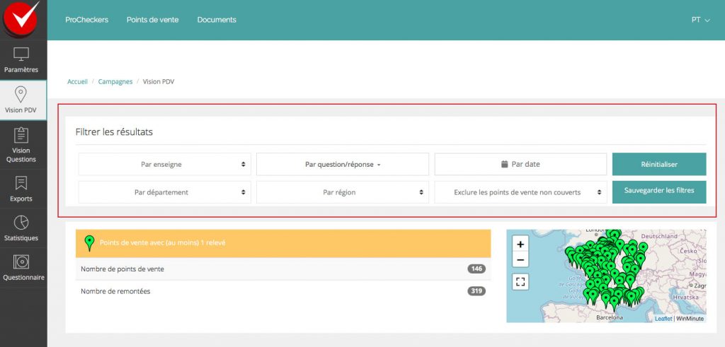 - L’usage des filtres est optimisé : plus lisibles et pratiques, l’objectif est de consulter et exporter plus facilement les données pertinentes. Il est possible de filtrer les données par enseigne, par réponse à l’une des questions, par date, par département ou région, mais aussi par n’importe quel axe spécifique au client : selon un découpage géographique propre, par chef de secteur, par niveau d’importance des points de vente, etc.