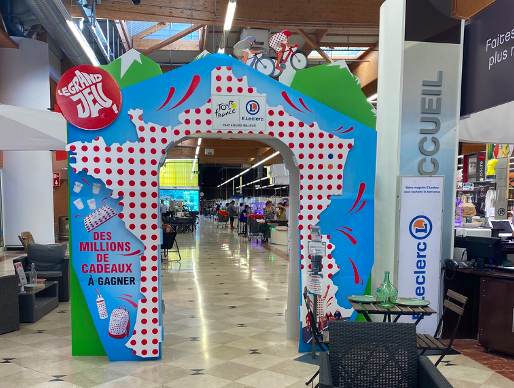 C’est le cas du E.Leclerc à Chatte (38) qui propose aux consommateurs d’entrer dans son magasin en passant par une arche aux couleurs du Tour de France.