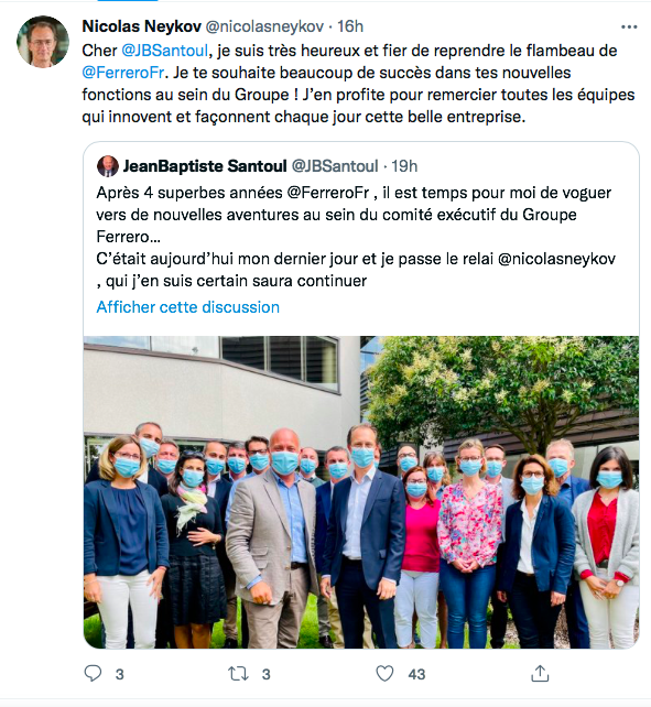 La rentrée 2021 est marquée par le changement chez Ferrero. Jean-Baptiste Santoul laisse sa place à Nicolas Neykov qui devient le nouveau Directeur Général de Ferrero en France. Présent dans le groupe depuis 2007, Nicolas Neykov a travaillé dans le département marketing, puis est devenu en 2019 le Général Manager Ferrero dans la zone Asie Pacifique.